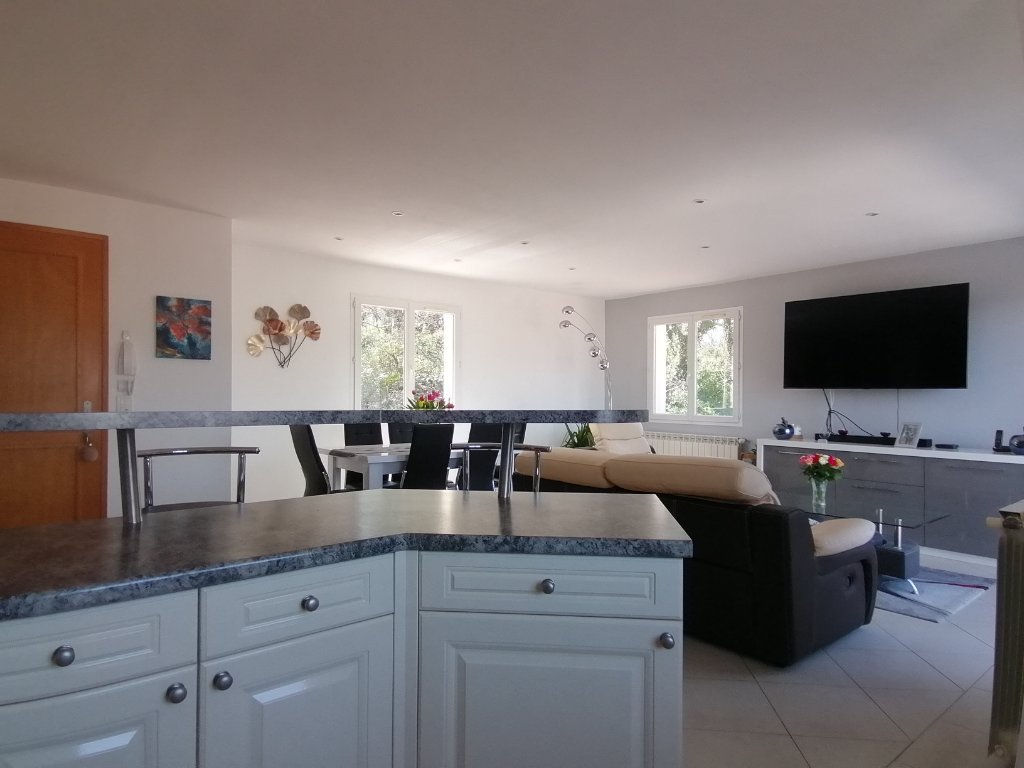 EXCLUSIVITÉ - A Fayence, maison idéalement située dans un environnement résidentiel calme, proche commerces, composée en rez-de-jardin d'une entrée, un salon / séjour donnant sur une belle terrasse avec vue sur le village , une cuisine ouverte équipée, trois chambres, une salle de bain et WC.
