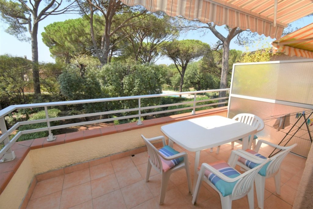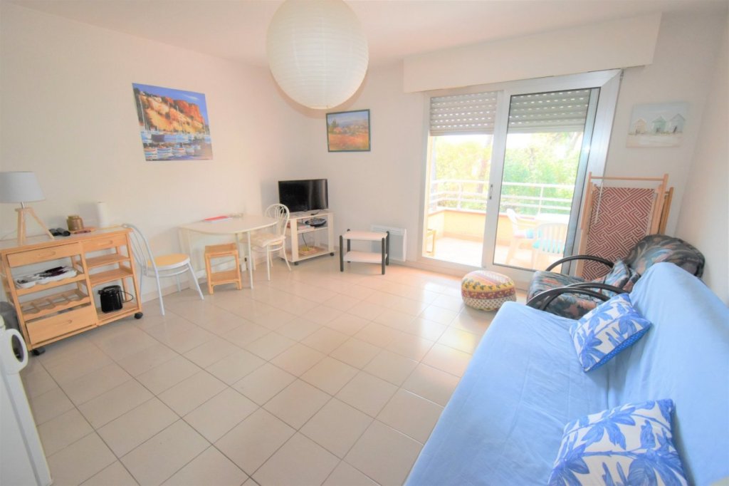 Dans une petite résidence avec piscine, appartement avec terrasse en plein cœur des golfs, comprenant entrée avec coin nuit salle d'eau, WC, pièce principal avec kitchenette et une place de parking .